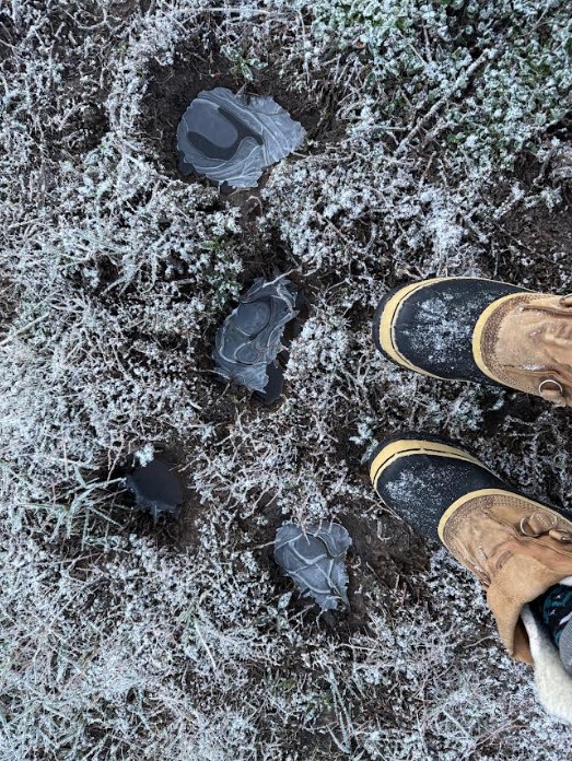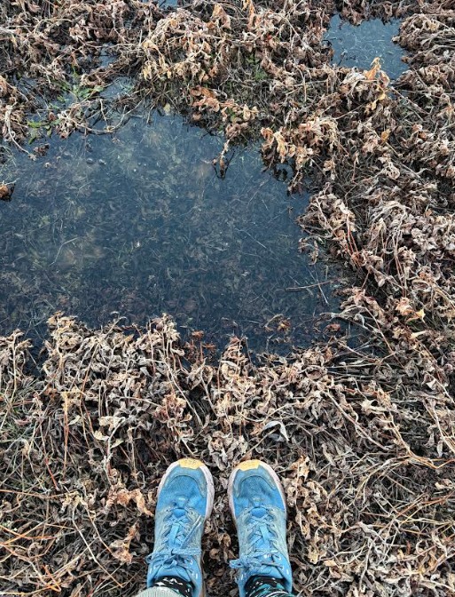At the wetlands, yesterday’s slosh had turned to crunch. The same ground, different sound. A thin layer of snow and frost had settled over everything like a quiet reset. I crossed my makeshift bridge and followed the same path. Familiar now. Almost easy.