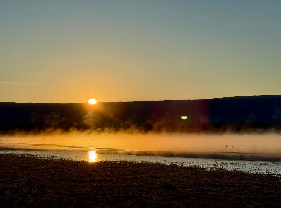 I turned east. The mountains were softened by early light, but then the sunrise began—an orange blaze reflected in the mist, turning the valley to fire. It rose from the fog like a living flame. Steady. Clear. Uncovered. Brighter than any sunrise this week.