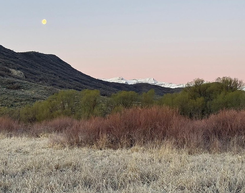 Out west, the moon was finishing what it started. Yesterday, it dipped behind Timpanogos. Today, just slightly south, over a neighboring peak. Small shifts. Easy to miss if you’re not paying attention, which I usually am not. The mountains held the moon’s light for a few final moments before it slipped away.